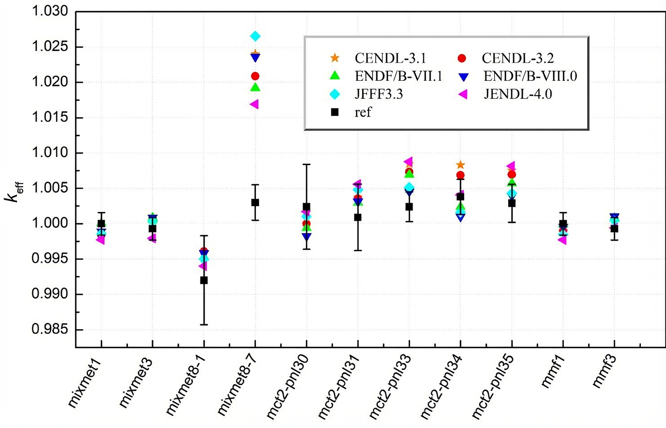 (3) Most benchmark case values in different data libraries were within the 3σ interval with 99.7% confidence. A few benchmark cases (e.g., 23umet4b, pumet8b, and mixmet8-7) have values exceeding the 3σ interval for all libraries. The reason for the large deviation between mixmet8-7 calculated values and experimental values requires further study.