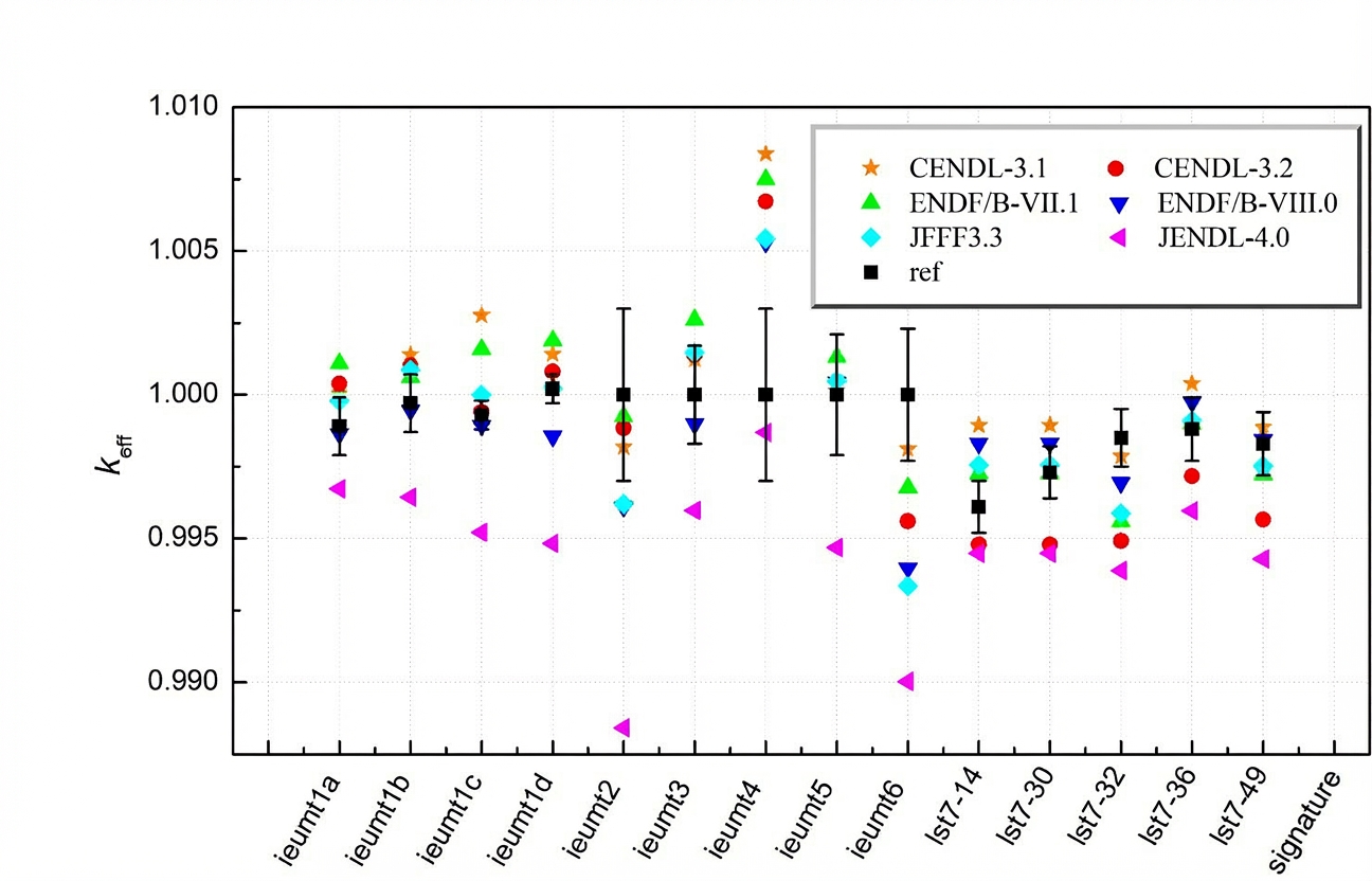 (2) Comprehensive device analysis and and values demonstrate that ENDF/B-VIII.0 and JEFF3.3 have basically equivalent overall criticality calculation performance, while ENDF/B-VII.1 offers the best performance. CENDL-3.2 is improved compared to CENDL-3.1 and is better than JENDL-4.0. CENDL-3.2 performed better in 233U assembly calculations but poorly in pusl11 series Pu device calculations, requiring further improvement.