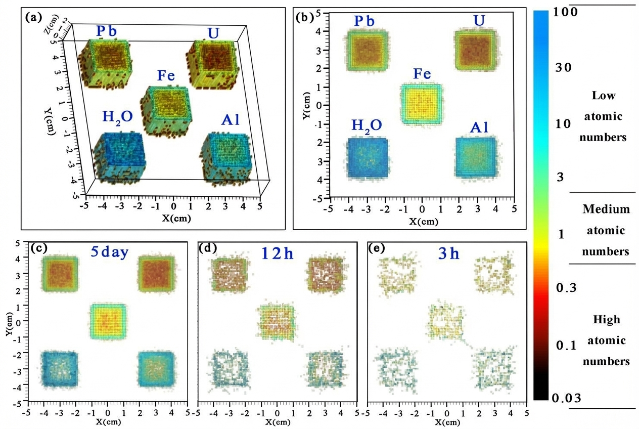 Figures 7(c), (d), and (e) show 4D imaging results for different durations. With 5 days of imaging, the system distinguishes low-, medium-, and high-Z objects. At 12 hours, medium- and high-Z objects become difficult to differentiate, though low-Z targets remain clear. At only 3 hours, shape discrimination fails, but low-Z objects can still be distinguished from medium-Z materials. Thus, low- and medium-Z objects are easily differentiated, while medium- and high-Z objects are less distinguishable. Since muon multiple scattering imaging excels for medium- and high-Z objects, combining both systems would yield superior overall performance.