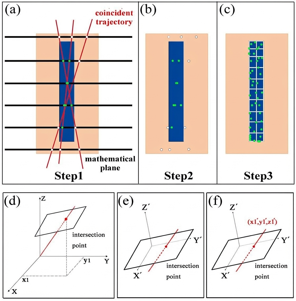 where α₁, α₂, α₃ denote angles between the X-axis and the X, Y, Z axes respectively, while β₁, β₂, β₃, γ₁, γ₂, γ₃ represent corresponding angles for the Y and Z axes. In this new coordinate system, intersection coordinates can be calculated using the Z-perpendicular plane method. Second, these coordinates are transformed back to the original XYZ system (Figure 4(f)) using: