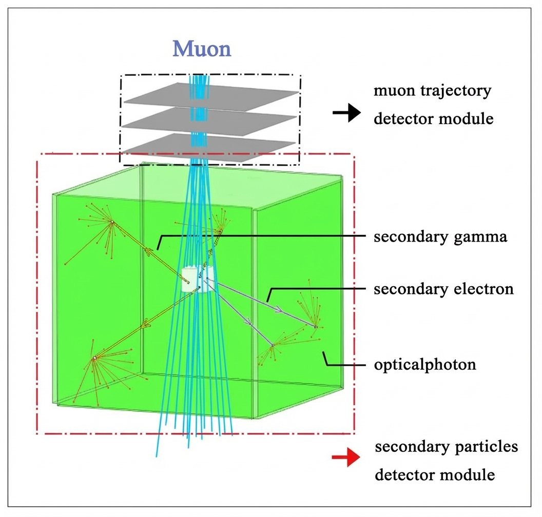 Simulations were performed using GEANT4.10.6p-03, with the generic model visualized through the Geant4 OpenGL interface (Figure 1). The detector system consists of two modules. The muon trajectory detector module comprises three layers of position-sensitive detectors that obtain precise muon hit positions and reconstruct trajectories. Each detector measures 400 mm × 400 mm × 10 mm, with 50 mm spacing between the bottom of the top detector and the top of the bottom detector. Located at the system's top, these detectors are micro-filter gaseous detectors. The secondary particle detector module consists of four EJ200 scintillation detectors in a box-like configuration surrounding the target object. Designed for large detection coverage, each scintillator measures 500 mm × 500 mm × 50 mm. Compared to muon multiple scattering imaging systems, this new system requires only four additional scintillation detectors, making the two approaches readily compatible. The central white cube represents a 20 mm × 20 mm × 20 mm target object. When an incident muon penetrates this cube, secondary particles may be produced and recorded by the secondary particle detector module. Geant4 simulations were developed to study secondary particle generation and information extraction.