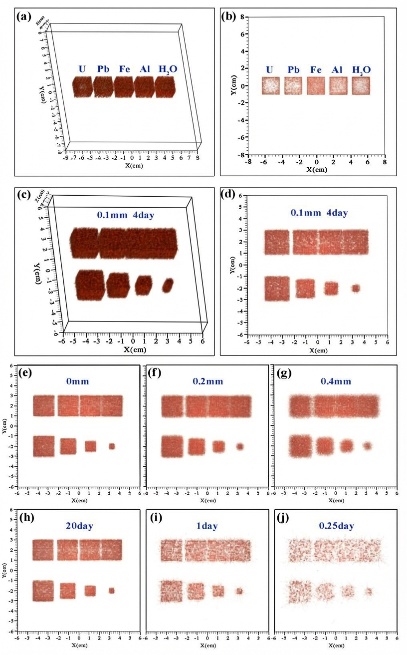 Since ionization loss and self-absorption depend on atomic number Z, imaging quality varies across materials. Figures 5(a) and 5(b) show 3D and top-view images of five 20 mm × 20 mm × 20 mm cubes made of H₂O, Al, Fe, Pb, and U. Due to uranium's substantially larger data yield compared to water, direct imaging would obscure the water signal, so simulations for each material were performed under identical conditions and then combined for comparison. For Pb and U, strong self-absorption in high-Z materials prevents secondary particles generated within the cube interior from escaping, creating large voids in the central regions. Consequently, imaging high-Z targets may lose central object information. Additionally, the straight-line muon trajectory assumption fails for high-Z materials, introducing larger errors than for other materials. For Al and H₂O, lower ionization losses in low-Z materials produce fewer coinciding muon trajectories, also creating some voids. However, this data insufficiency can be remedied by extending imaging time. Iron demonstrates the best imaging performance among all materials tested. In summary, this method effectively images low- and medium-Z objects, with optimal performance for medium-Z materials, but is less suitable for high-Z objects.