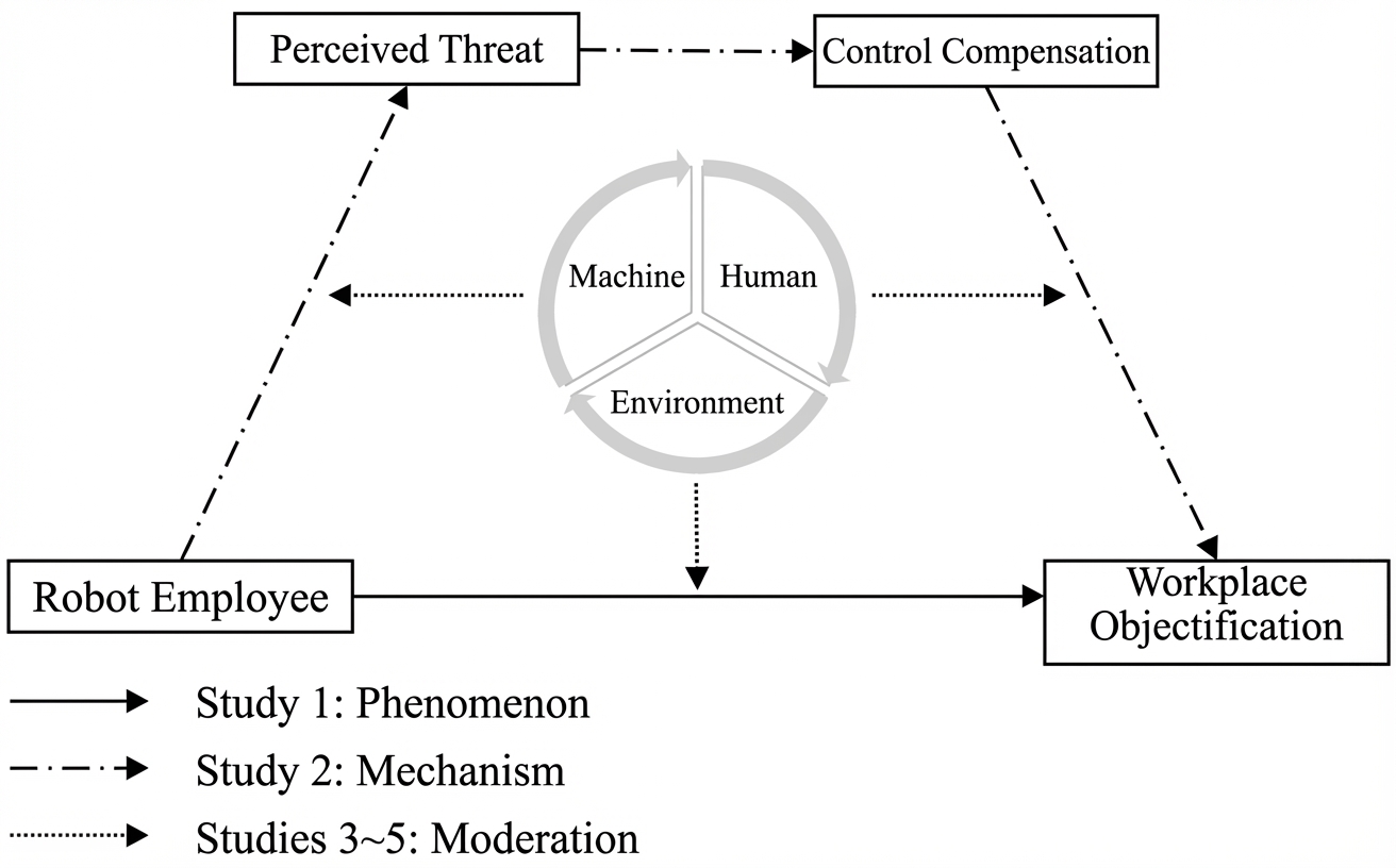 With continuous development of robotics technology, large numbers of robot workers have been introduced across industries. These robot workers pose realistic threats such as unemployment by occupying human positions, and identity threats by increasingly approximating humans in appearance and capability. Perceiving these threats will induce people to seek compensatory control and may restore their perceived control to baseline levels through the strategy of affirming nonspecific structures—that is, seeking and preferring simple, clear, and consistent explanations of the world. Workplace objectification is precisely such a simple, clear, and consistent explanation of others in the workplace, because simplifying others into objects often enables people to ignore the complex aspects of others as humans, such as the ambiguity and instability of subjective and internal states, and instead view and treat others simply as objects. In summary, we believe robot workers bring realistic and identity threats to humans, and perceiving these threats makes people seek compensatory control and ultimately objectify others in the workplace to restore perceived control.